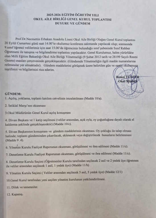 OKUL AİLE BİRLİĞİ GENEL KURUL DUYURUSU